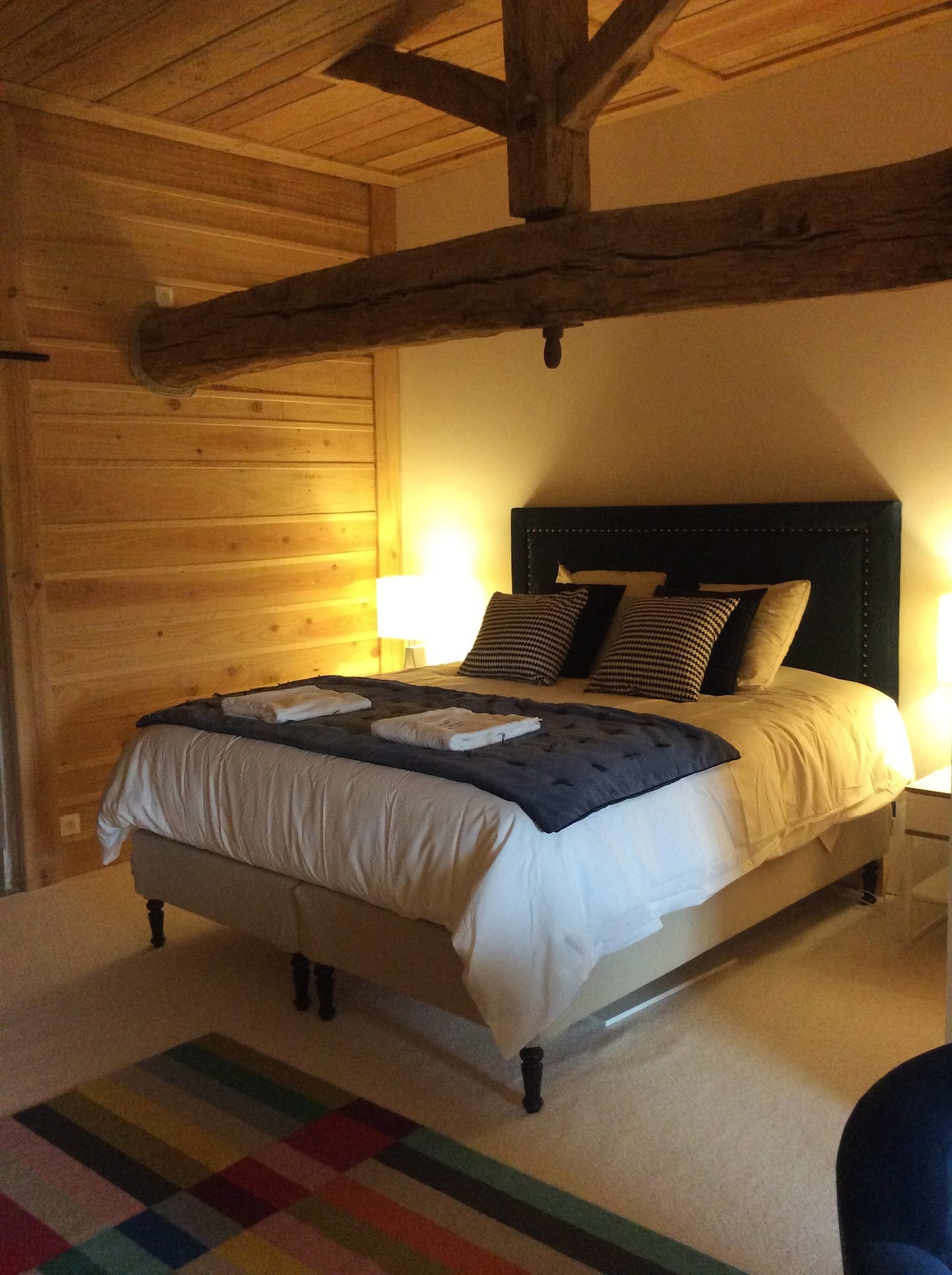 À l’étage, ce sont trois suites de 30 m2 chacune qui vous attendent. Bien entendu, chaque suite dispose de ses propres sanitaires avec belle douche à l’italienne et wc et de son propre espace salon et bureau. Nombreux rangements et décoration chaleureuse. Chaque chambre a un lit king-size de 180×200, matelas qualité hôtelière et sur-matelas… Deux suites ont accès à un balcon terrasse de 20 m2, plein ouest, avec fauteuils et tables de jardin, d’où les plus matinaux pourront admirer biches et cervidés. La troisième suite n’a pas de balcon et est orientée vers le sud.