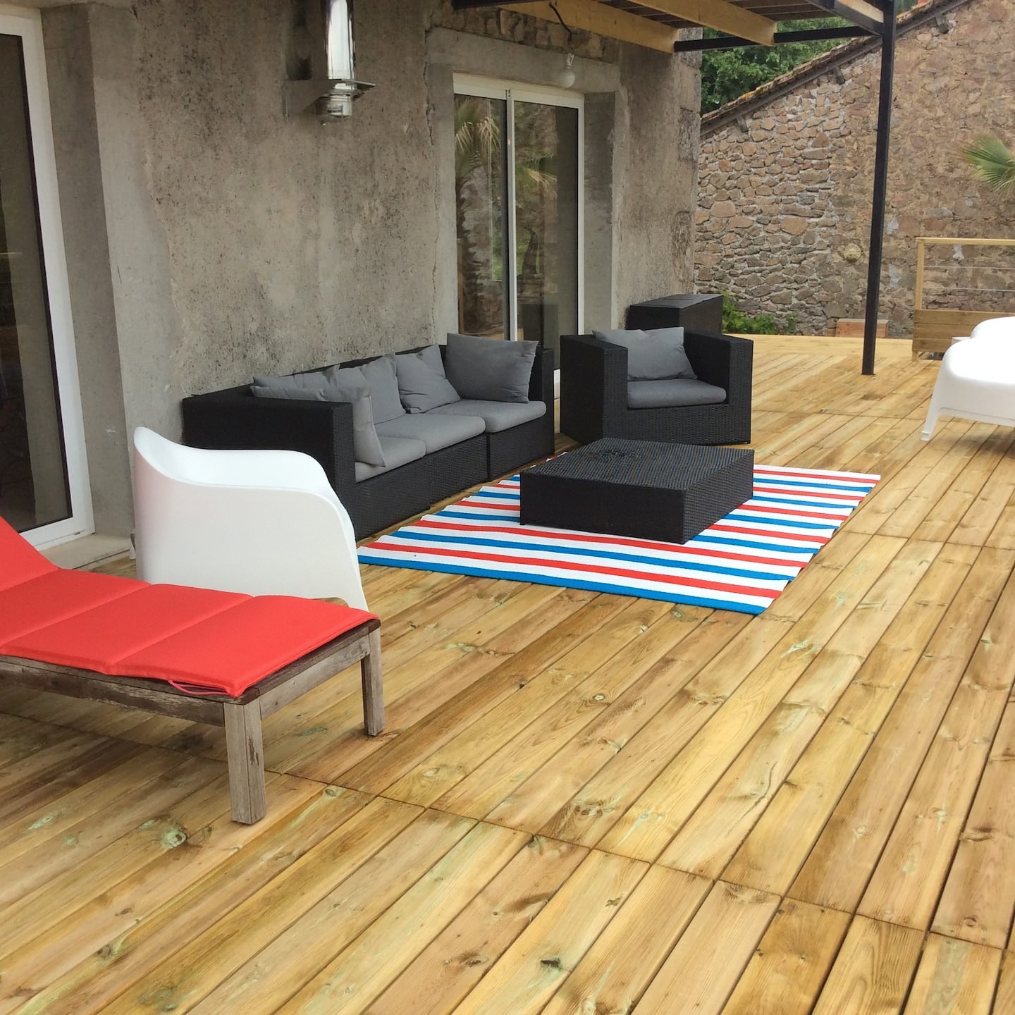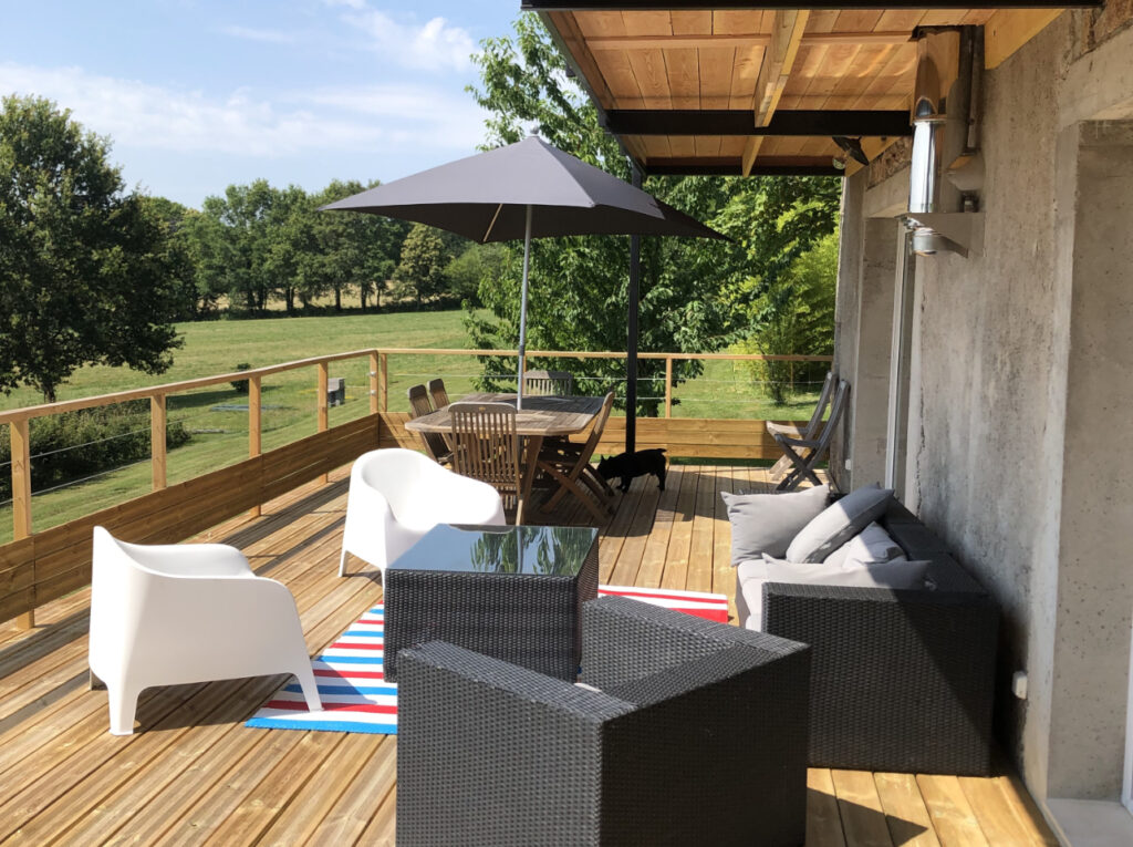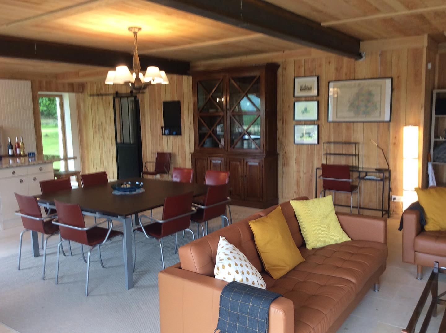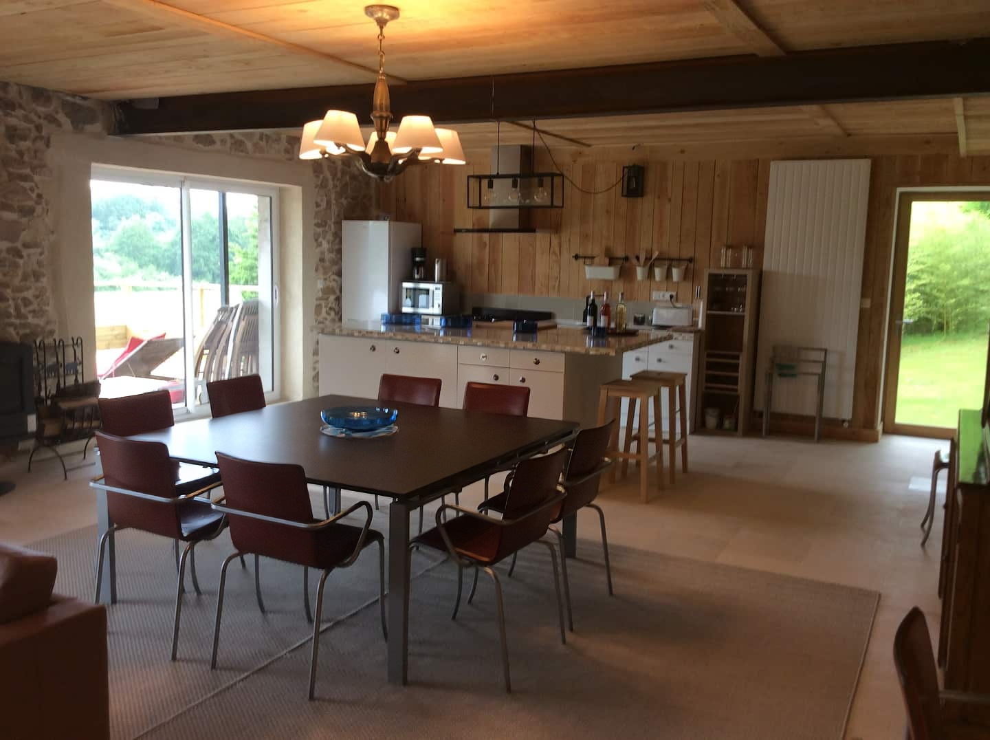 Le gîte pour 6 personnes, avec pierres apparentes et murs en bois brut de sciage, dispose d’une décoration « glam-chic » exclusive et chaleureuse. Au rez-de-chaussée vous profiterez d’une grande pièce à vivre de 70 m2 avec cuisine tout équipée, lave vaisselle, grand four, îlot central… , un espace pour déjeuner ou dîner à l’intérieur, grande table pour 8 avec chaises en cuir, un coin salon avec grand écran, banquettes en cuir, cheminée avec bois à disposition. Les deux grandes baies vitrées donnent sur votre magnifique terrasse de 55 m2, avec grande table pour 8 personnes, salon de jardin, transats, parasols…